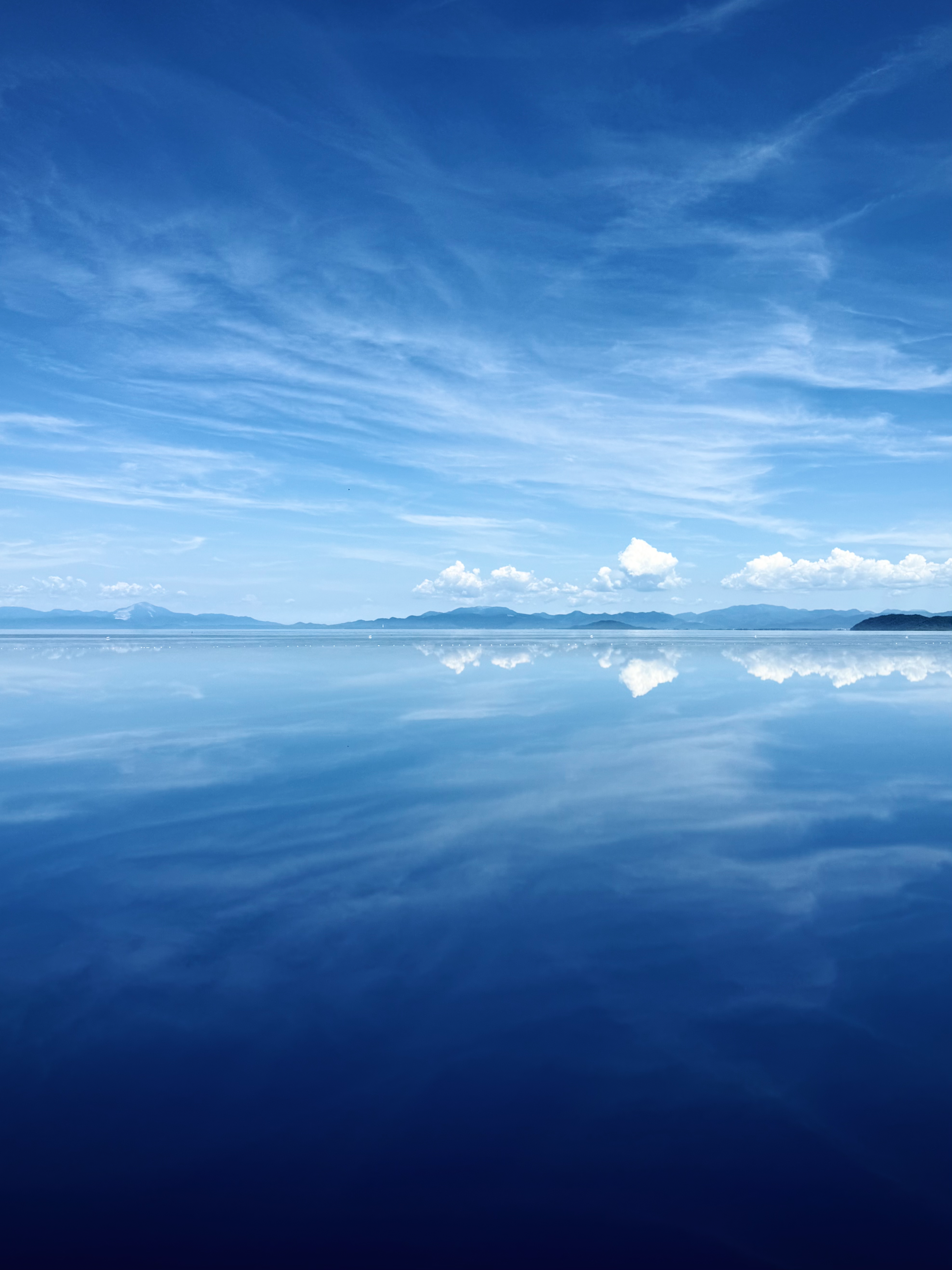 青と白で構成された景色は開放感があり、非日常的な印象を受けました。琵琶湖、中浜水泳場を鏡面を利用して撮影した一枚です。