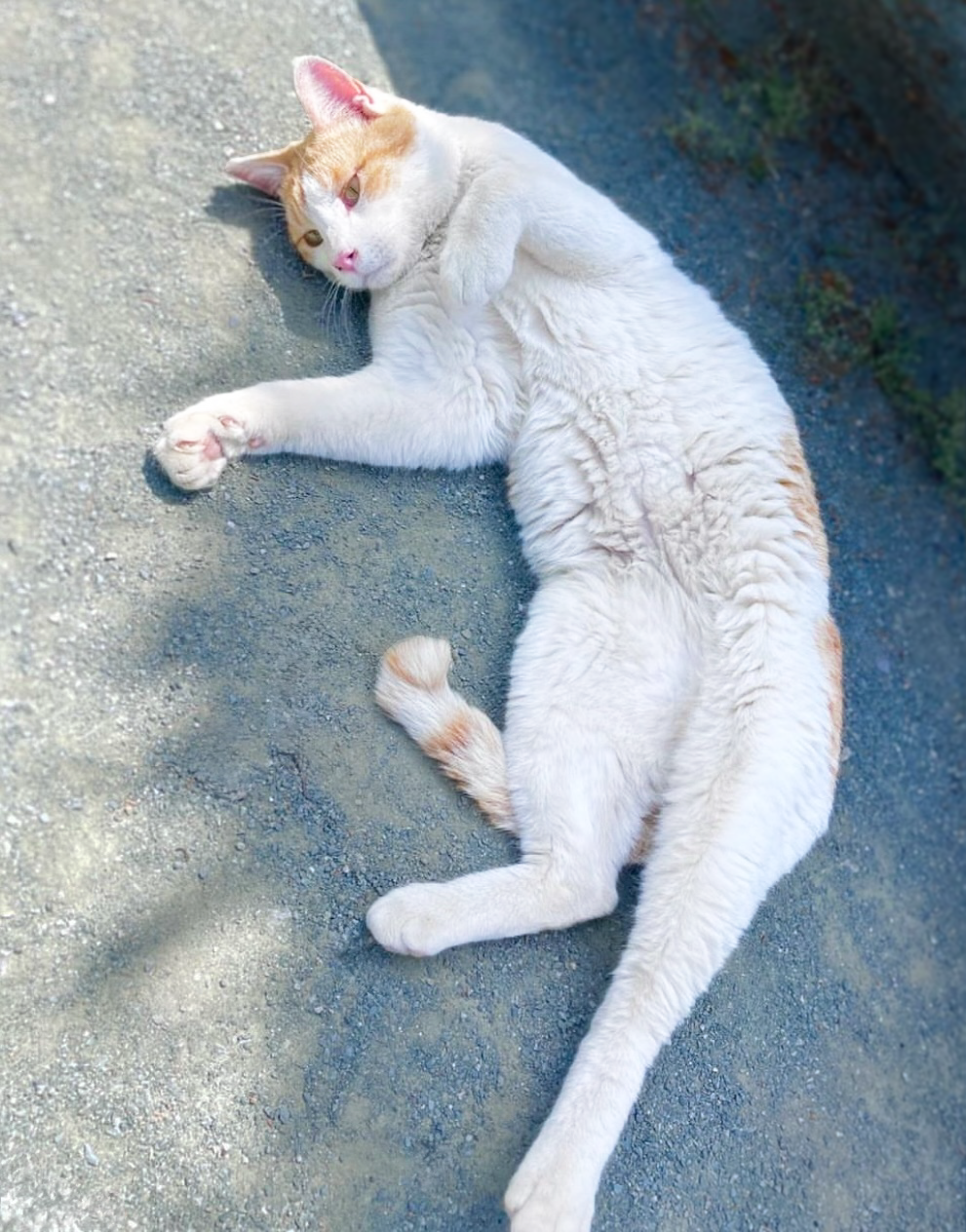 愛猫の春吉くんが、まだ地域猫だった頃に公園で一緒に過ごした際のひとコマ。彼ののんびりとした雰囲気と公園の青味がかって映る砂が相まって、夏の涼しさを感じた一枚です。