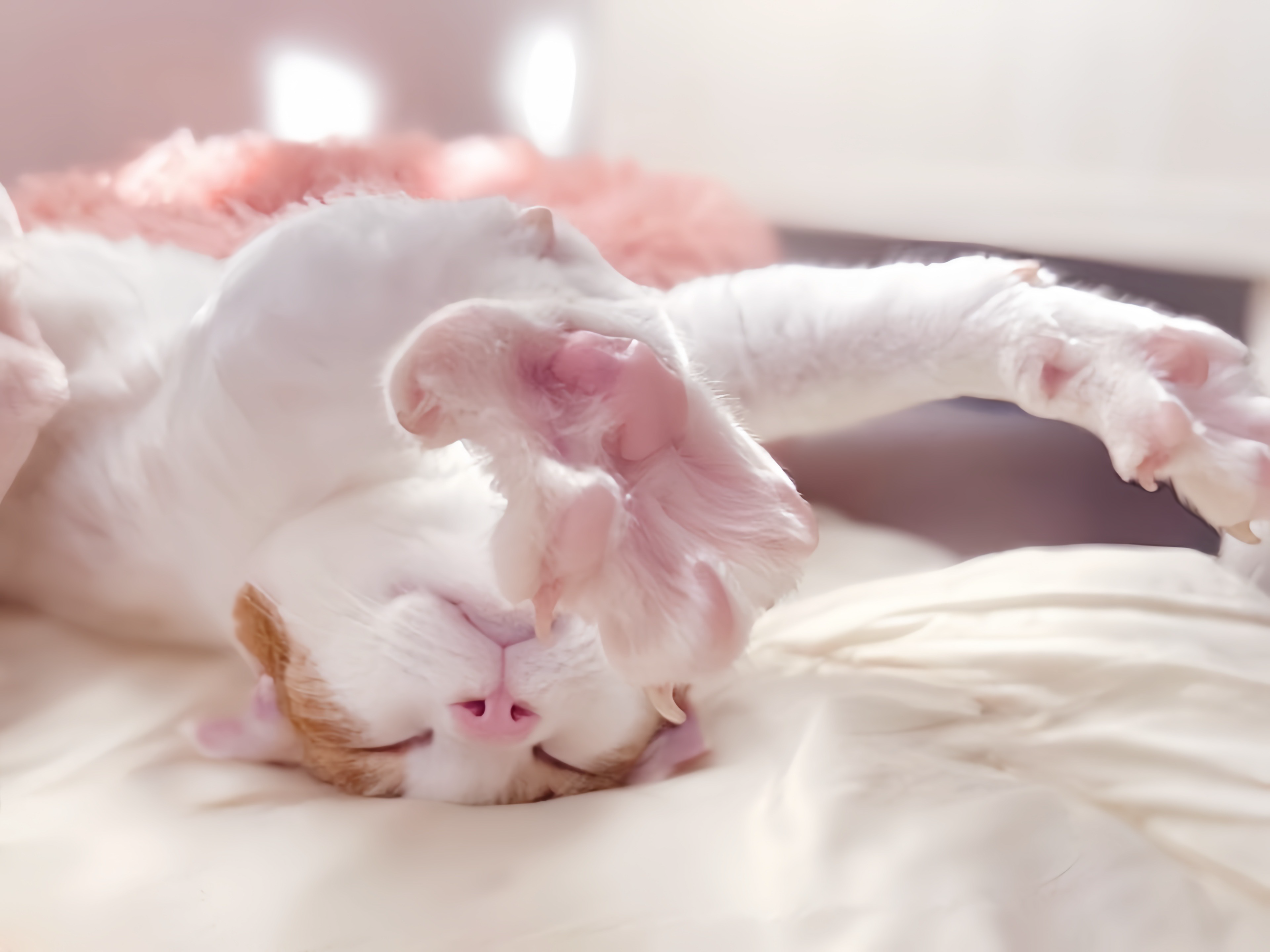 愛猫の春吉くんがお昼寝中、伸びている瞬間をパシャリ。チャームポイントのピンクの肉球やお部屋のクッションが似合う彼はとてもチャーミングな男の子です。全体をややピンクカラーで調整しています。