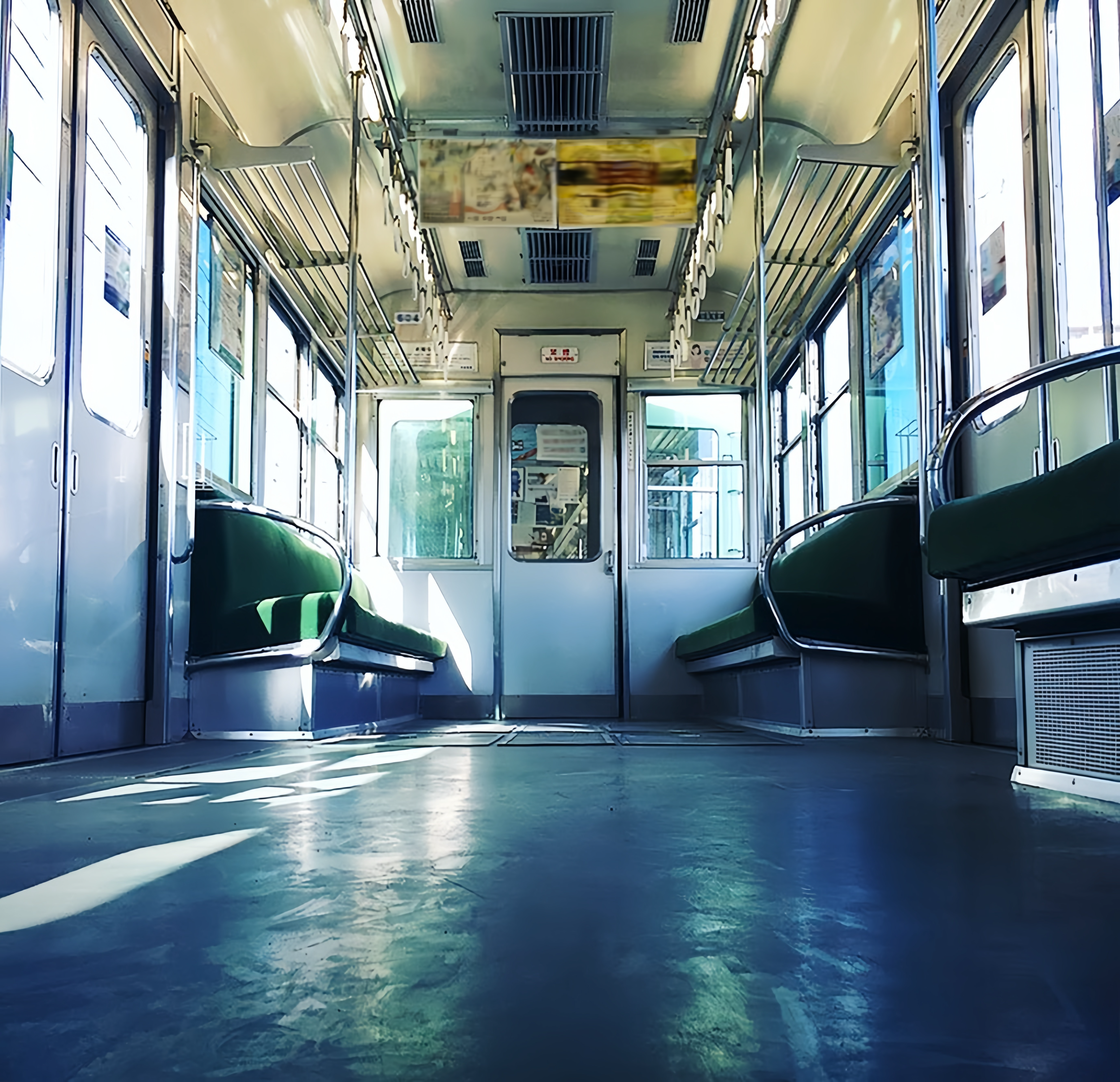 15年程前に訪れた、滋賀県草津方面の電車内の風景です。何気ない日常に溢れている好きな色のひとつ、緑や青がアクセントカラーになっている、懐かしい車内で思わず撮った一枚です。